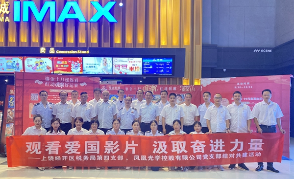 为丰富党史学习教育主题活动,进一步弘扬爱国主义精神,10月9日晚,凤凰控股党支部和经开区税务局第四支部在上饶市万达影院联合组织观看爱国影片《长津湖》结对共建活动。两个支部的党员和入党积极分子40人共同接受爱国主义教育。